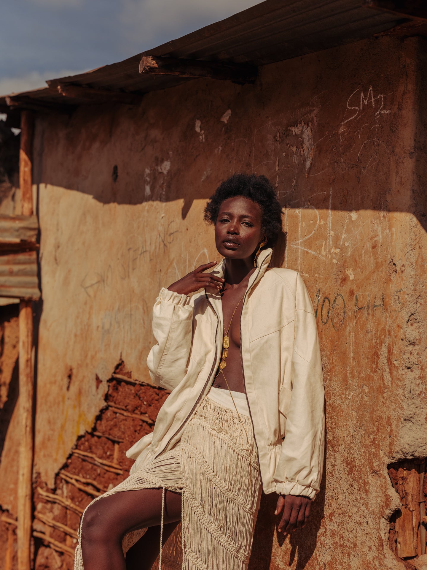 Gender-neutral fashion jacket in Kenyan woven cotton worn by runway model