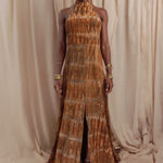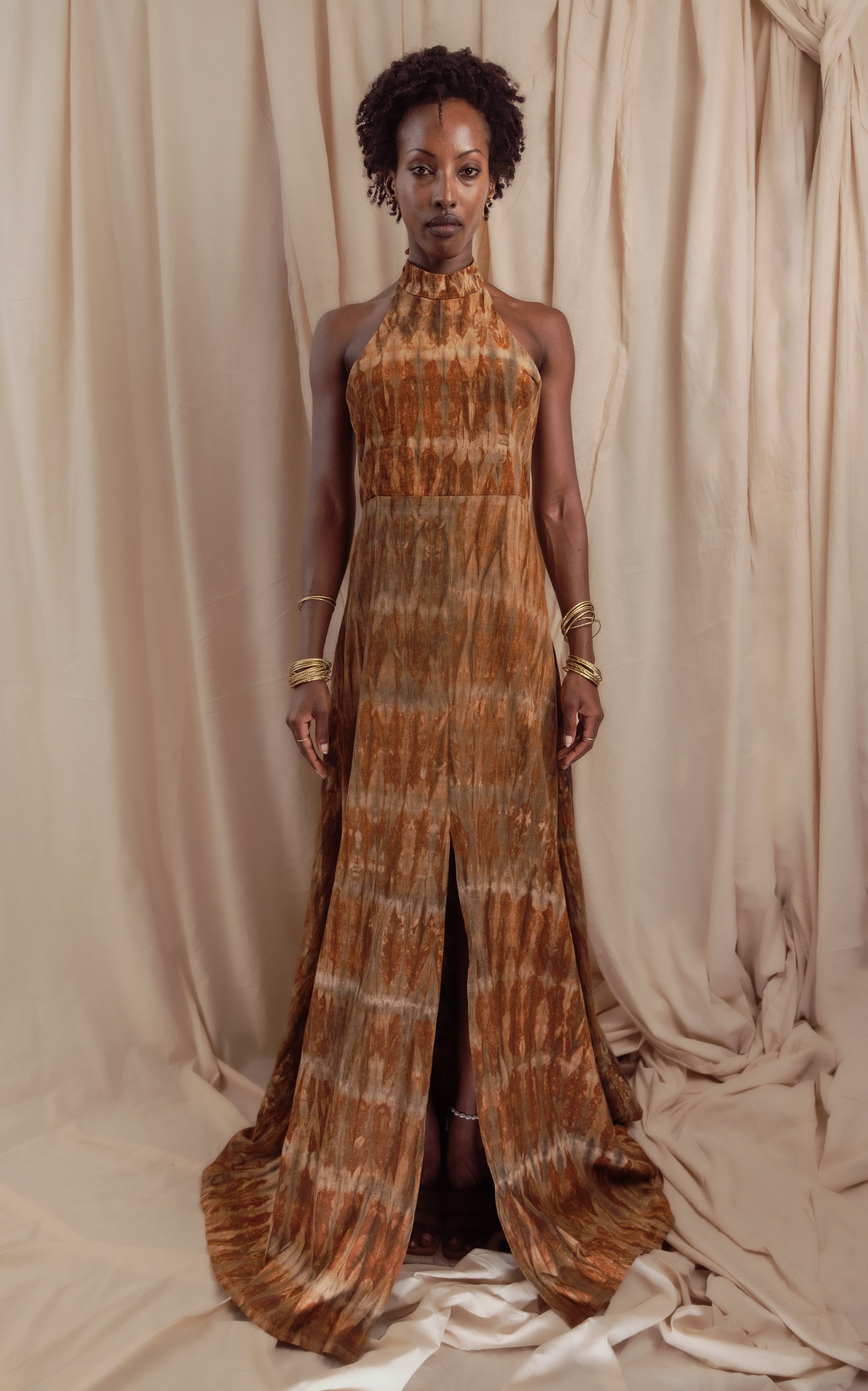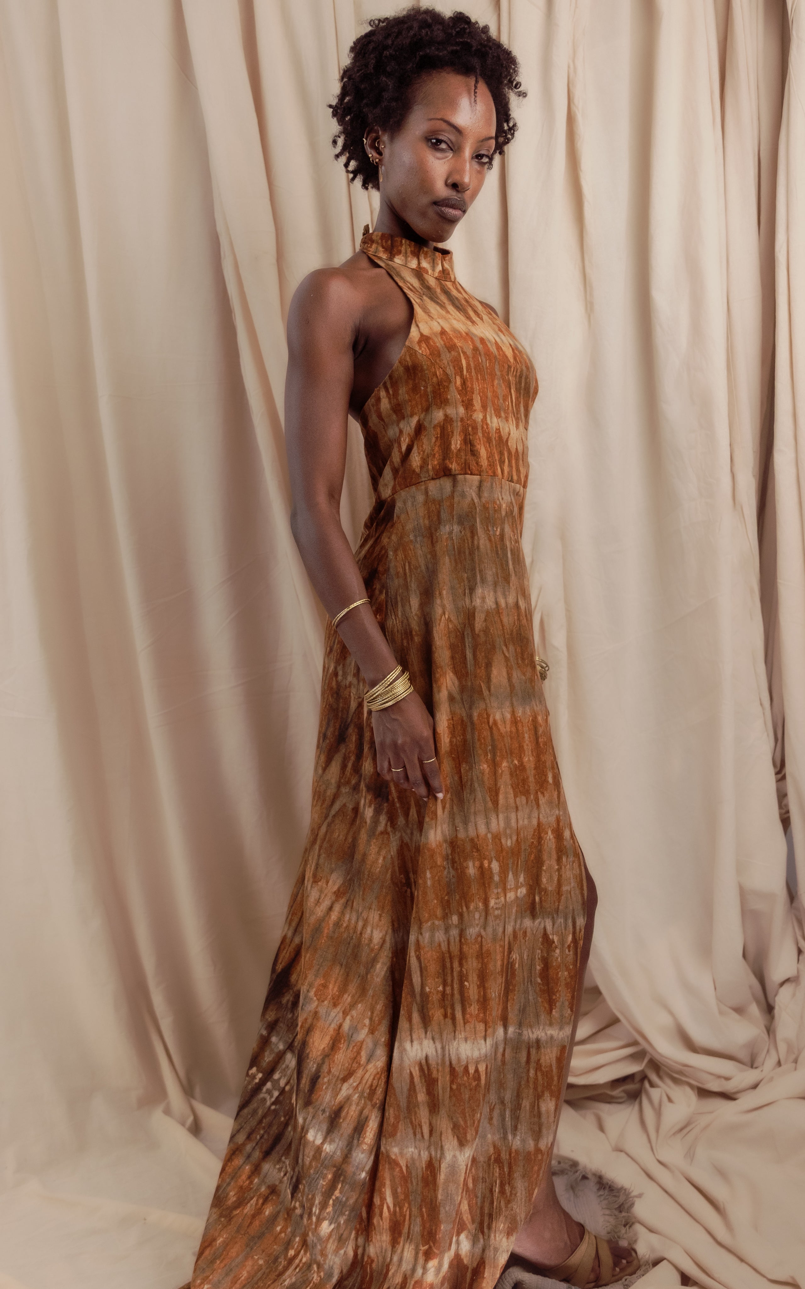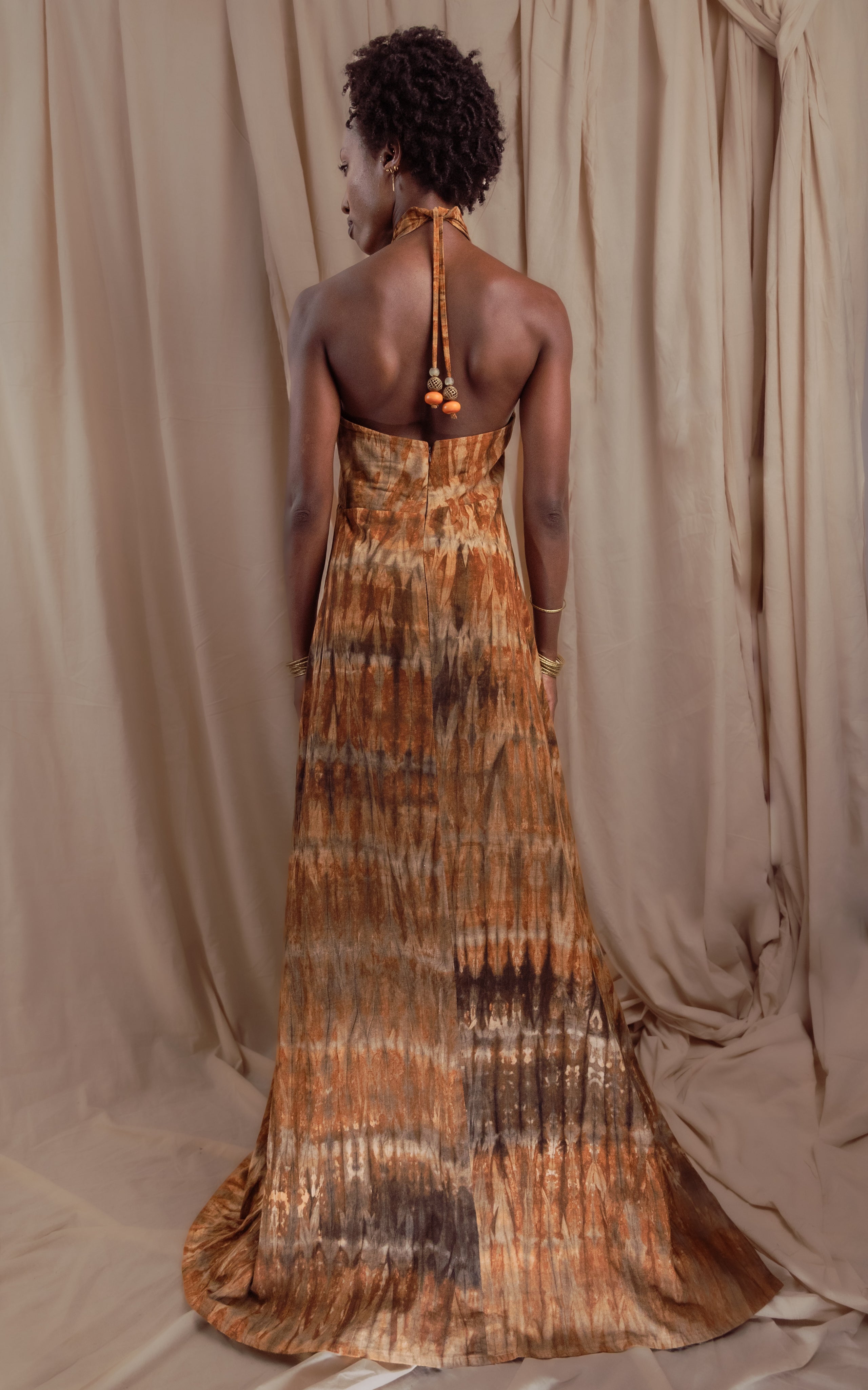 The racerback inspired front with beaded ties at the open back, full length dress, A-line, button down. Made from local origin, botanically dyed, rain-fed cotton. The Kali print is created entirely by hand in our Nairobi atelier. Fabricated and finished in-house, where each piece is hand dyed, assembled, with care.Produced in small-batch runs to maintain craftsmanship and consistency across wholesale orders. Crafted to order for our wholesale partners.