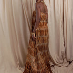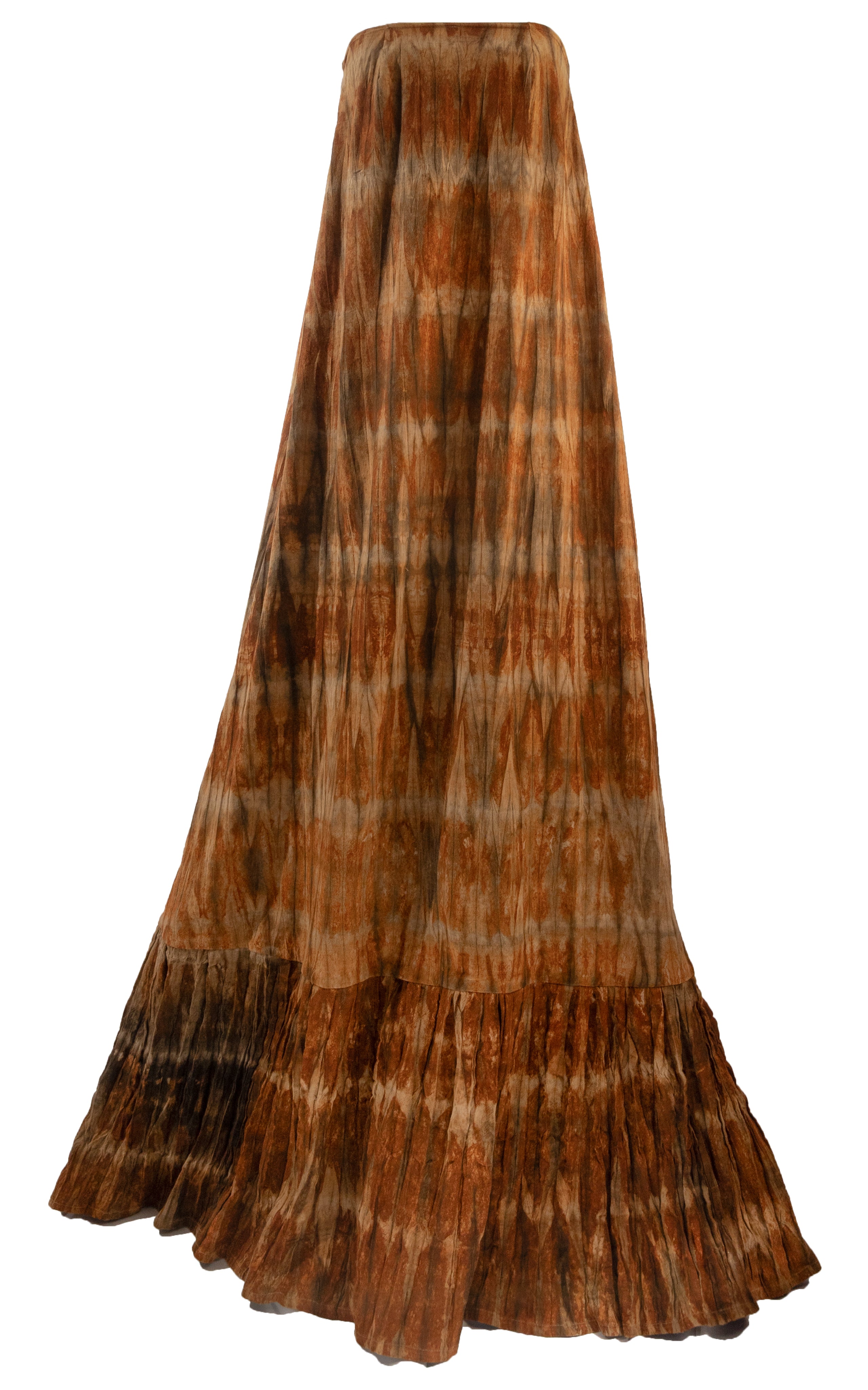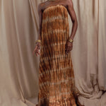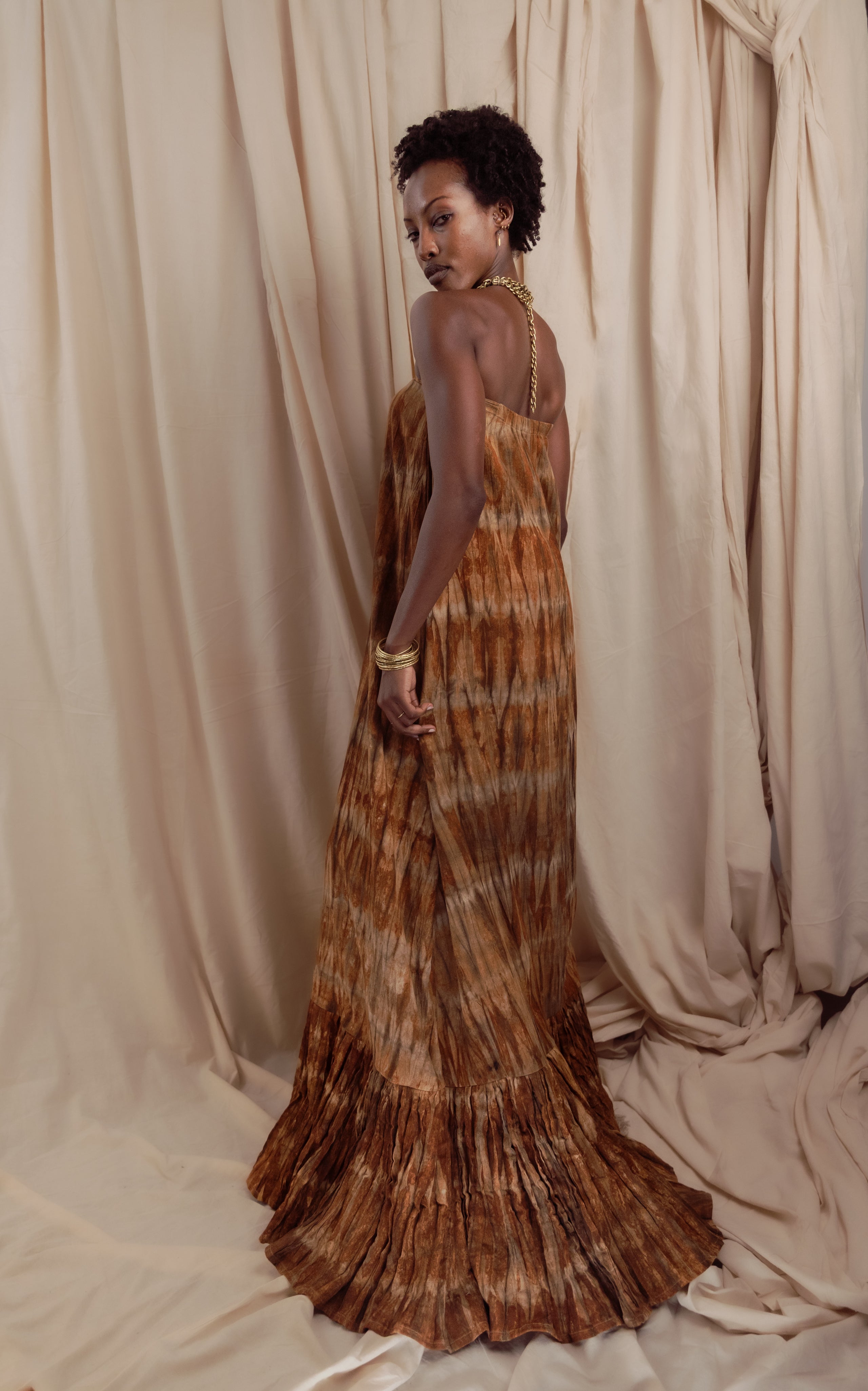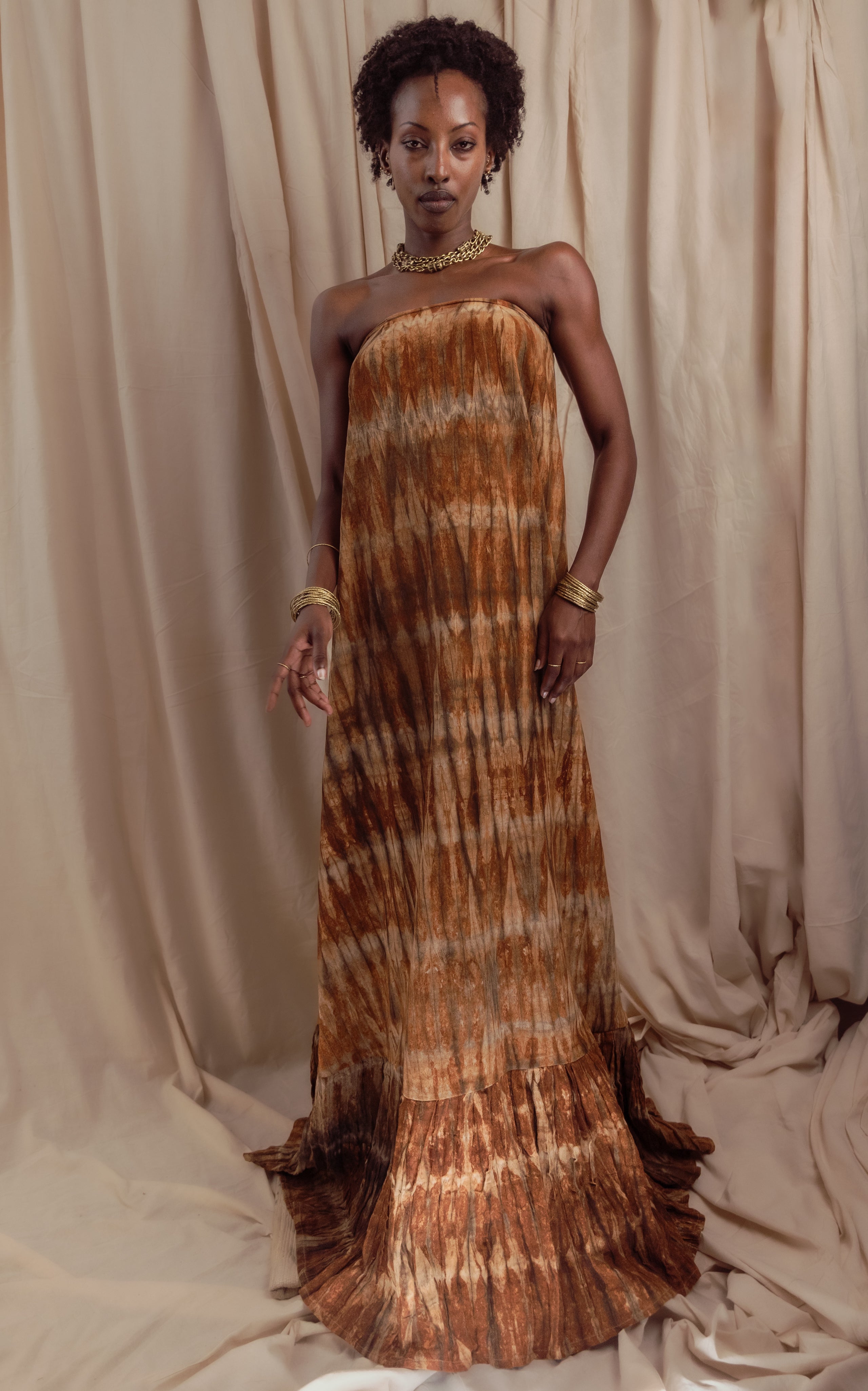 Strapless straight across neckline, a line maxi dress with crushed cotton detail. Made from local origin, botanically dyed, rain-fed cotton.Crushed texture is fabricated in our Nairobi atelier by hand, which moves with the natural contours of the body. The Kali print is also fabricated by hand in-house. Produced in small-batch runs to maintain craftsmanship and consistency across wholesale orders. Crafted to order for our wholesale partners with care.
