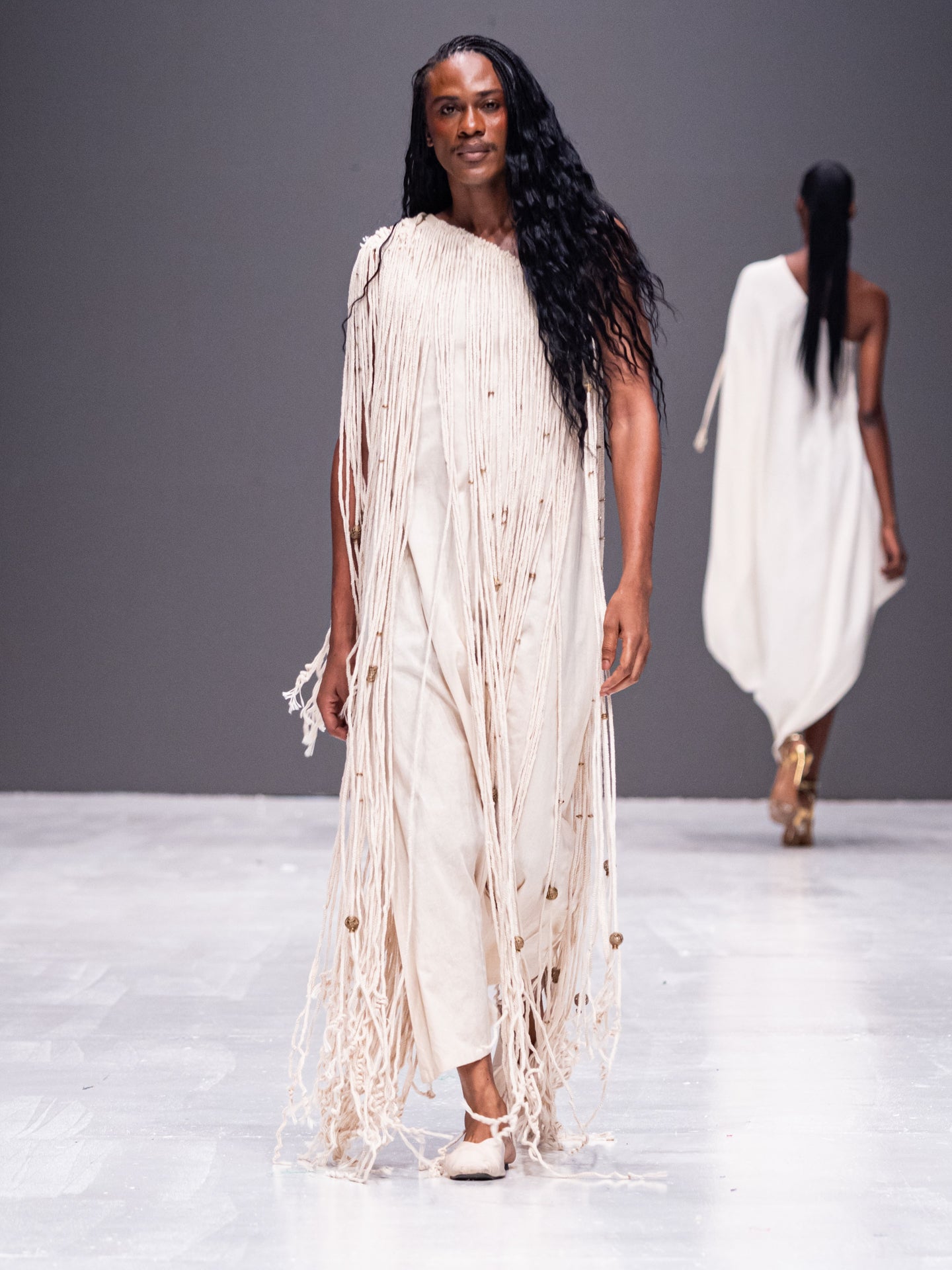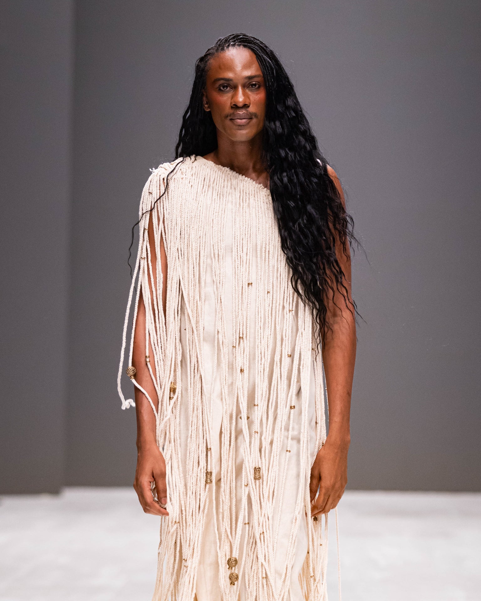 One shoulder dress, full length, straight column cut with handcrocheted long beaded fringe. Finished with antique handcast brass beads. Crafted to order for our wholesale partners with care.
