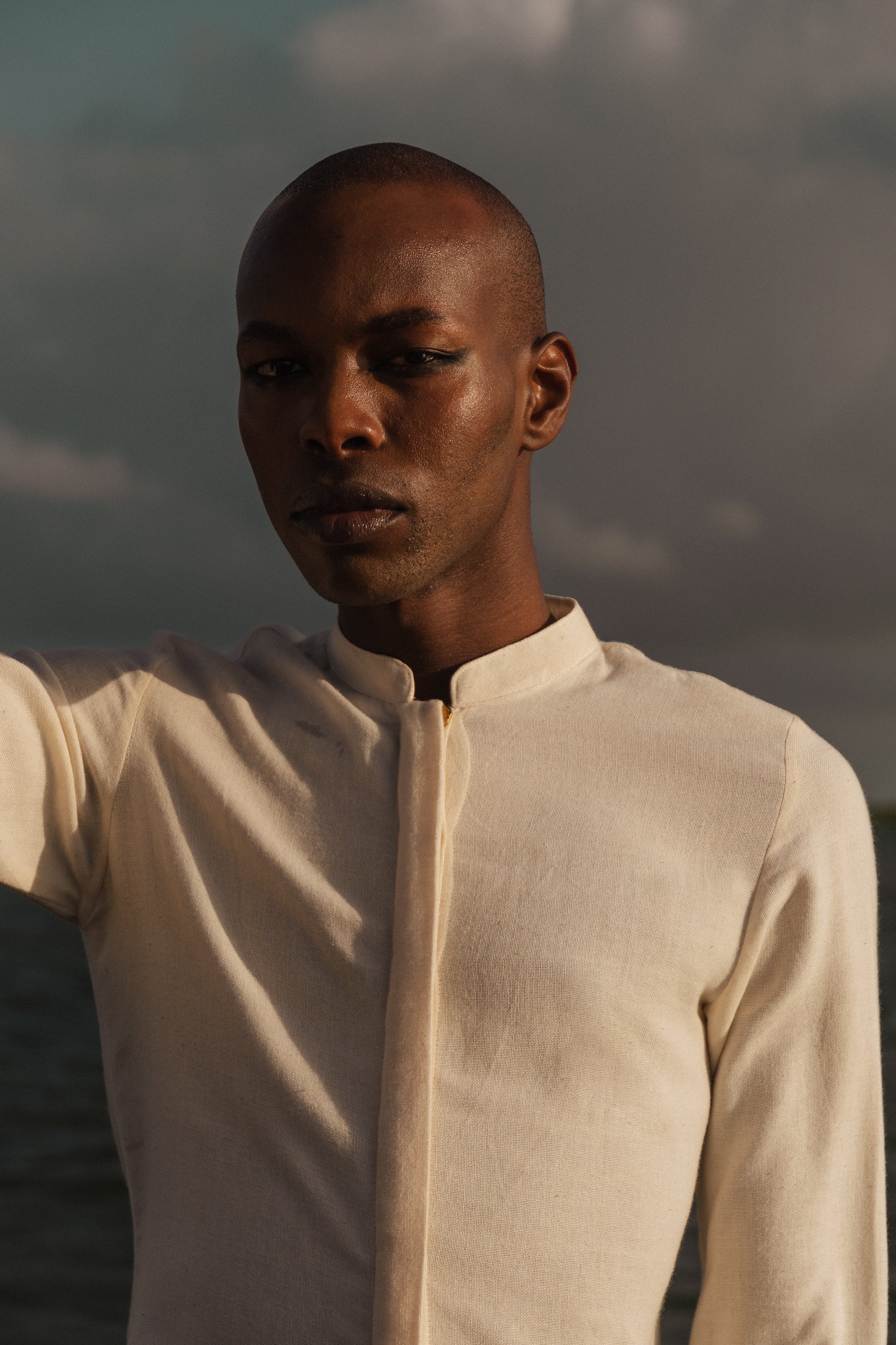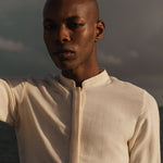 Nehru collar, long sleeve, classic cuffs & length. Gender neutral style. Finished with wooden & handcast feature brass buttons, in unique shapes.