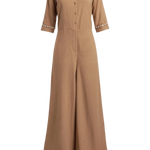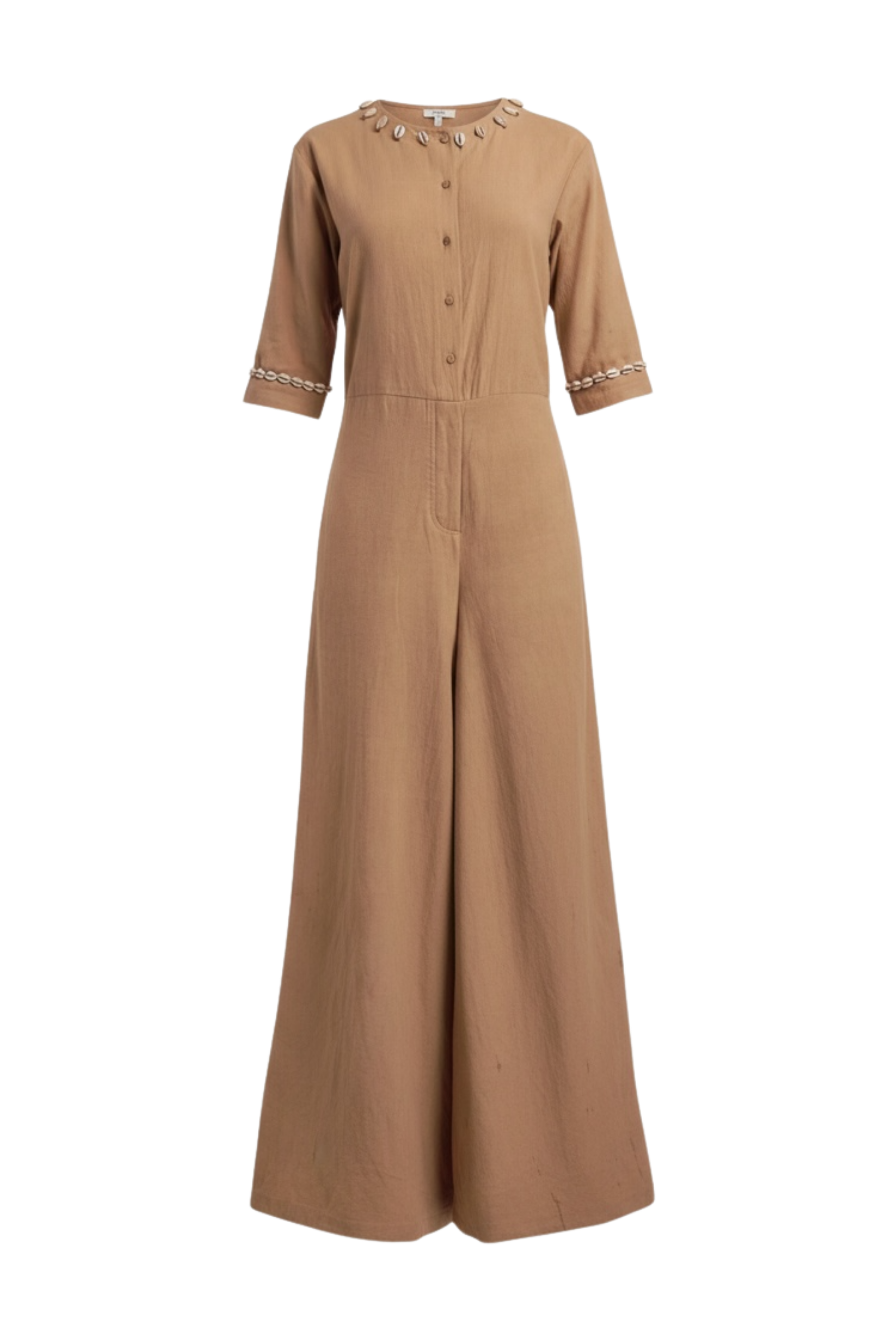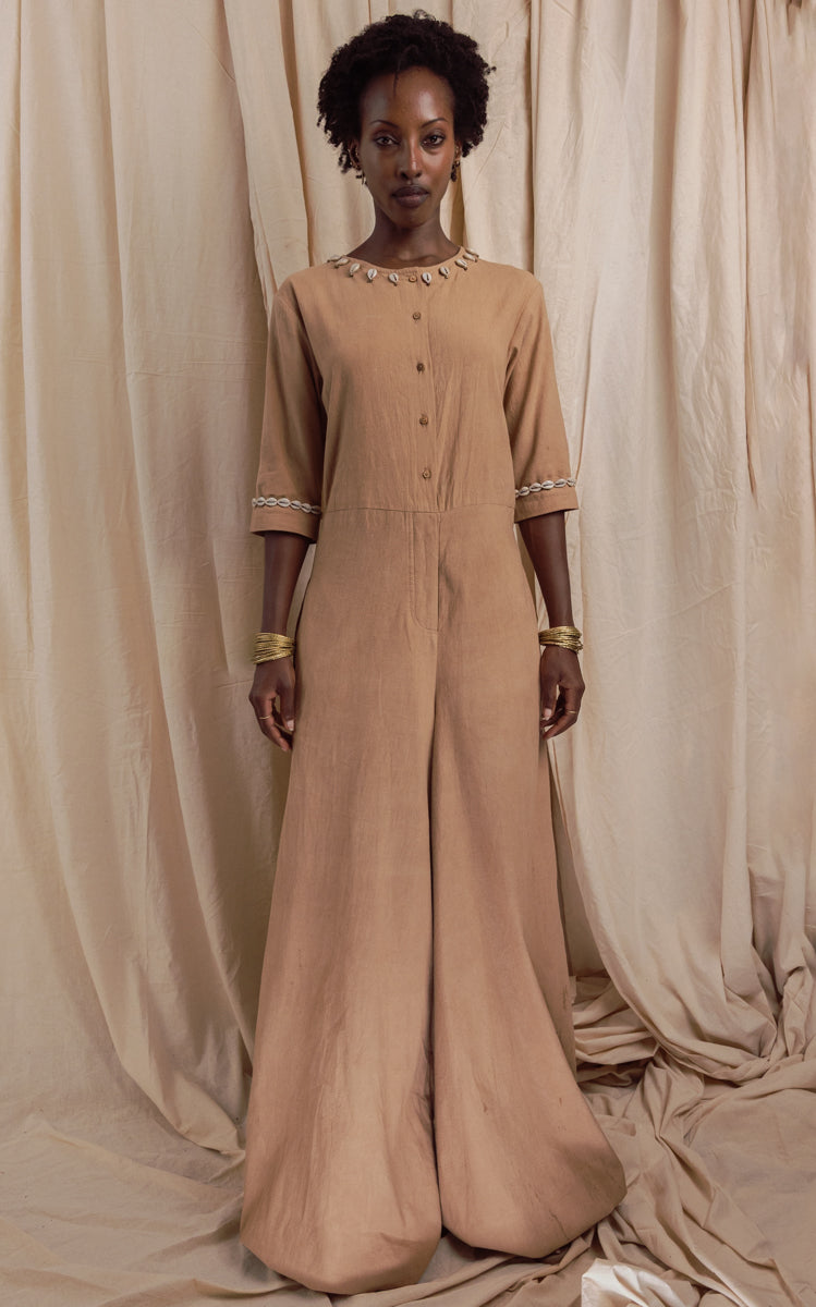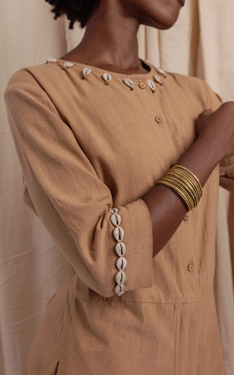 Half sleeve, round neck, wide leg, relaxed fit with with detachable beaded belt. Size adjustable +/- 1 dress size. Handbeaded cowrie shell detail & multiway neckline styling.